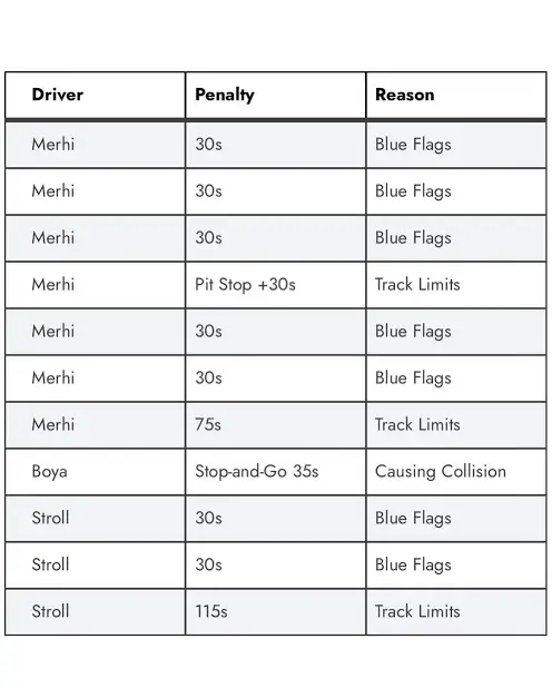STVARNOST NA STAZI Međutim, stvarnost se pokazala znatno težom. Nakon što su se kvalificirali tek na 15. mjesto, utrka se brzo počela raspadati zbog kazni i incidenata. Kada je Stroll preuzeo volan za posljednju dionicu, problemi su se nagomilali.